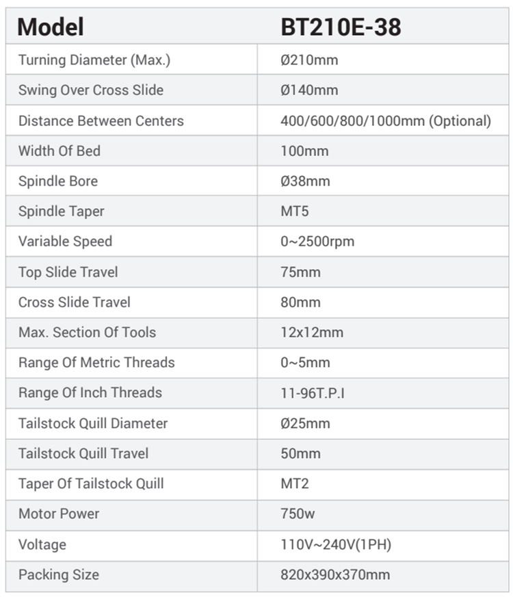 Home Essential BT210E-38 Manual Lathe for Mechanical Repair ShopsTurning Diameter (Max.):Ø210mmSwing Over Cross Slide:Ø140mmWidth Of Bed:100mmSpindle Bore:Ø38mmmini lathe machine , Manual Lathe , lathe machine Inquiry Send Email