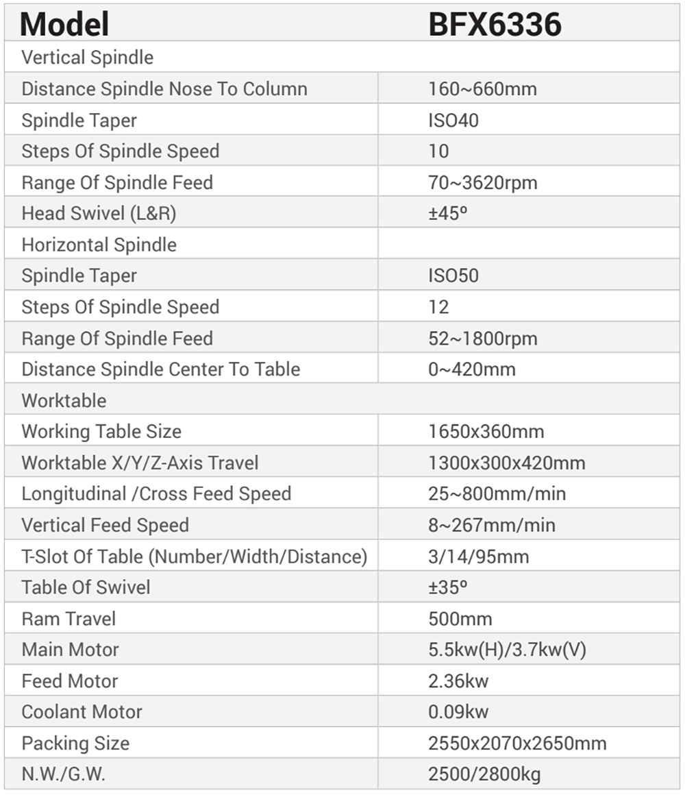 Milling Machine BFX6336 Universal High Precision Vertical&Horizontal Dual-purpose Milling MachineDistance Spindle Nose To Column:160~660mmSpindle Taper :ISO40Steps Of Spindle Speed:10Range Of Spindle Feed:70~3620rpm55KW Universal Milling Machine , Multifunctional Milling Machine , Industrial-grade milling machine Inquiry Send Email