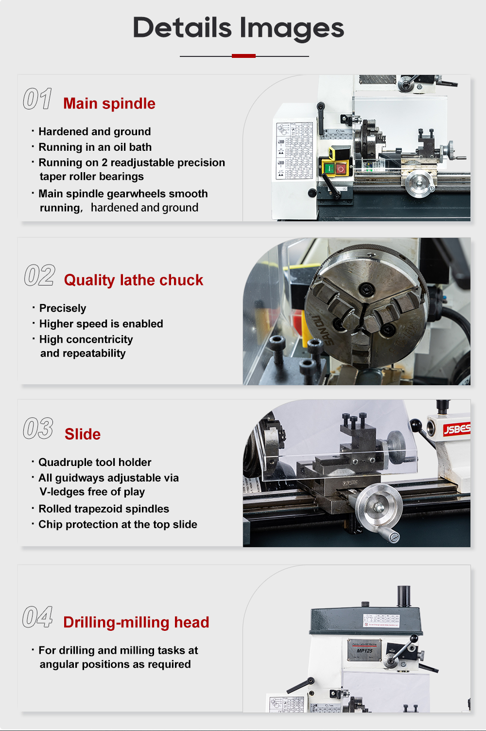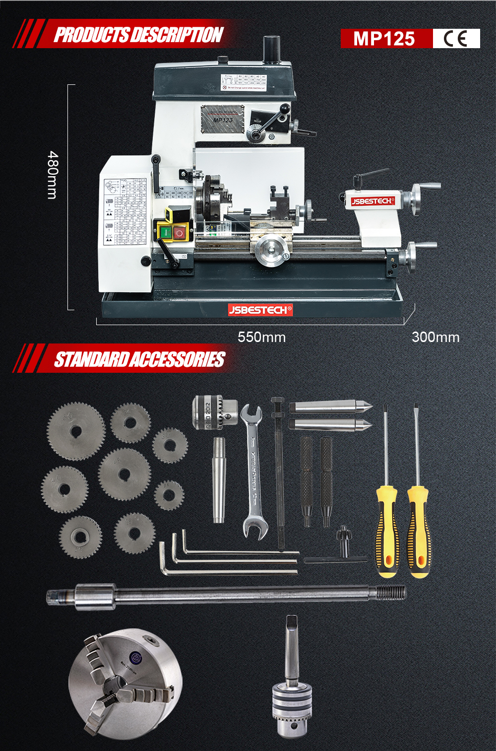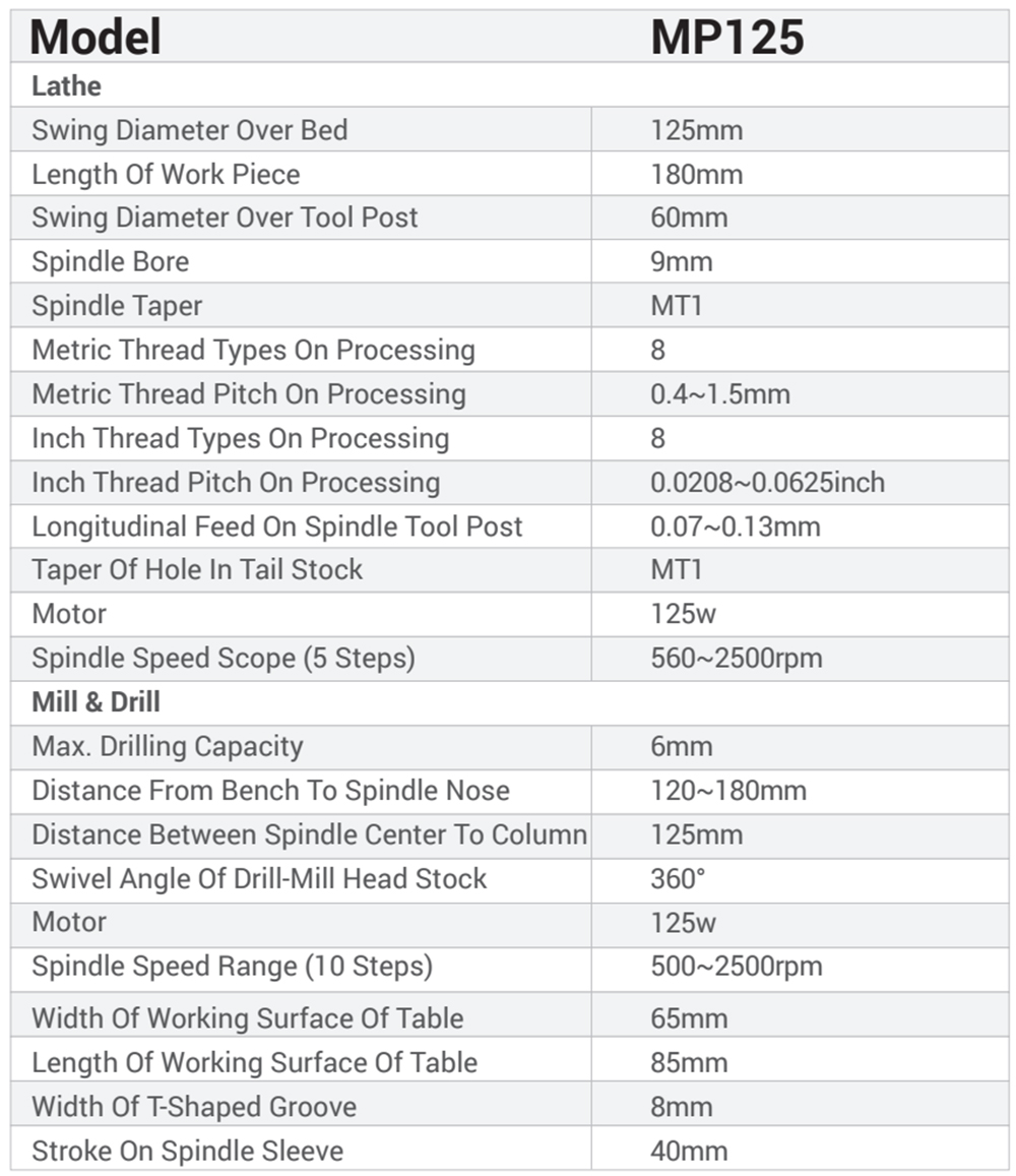 Parallel Lathe MP125 Hot Sales Multi-purpose Milling Lathe and Drilling Machine ComboSwing Diameter Over Bed:125mmLength Of Work Piece:180mmSwing Diameter Over Tool Post:60mmSpindle Bore:9mmlathe , multifunction lathe , drilling milling lathe , bench lathe , manual lathe machine Inquiry Send Email