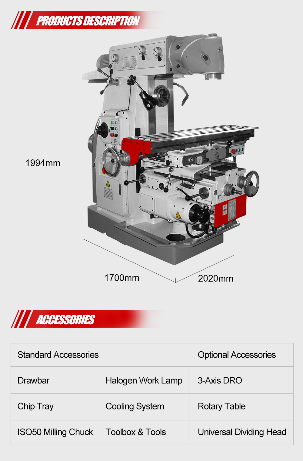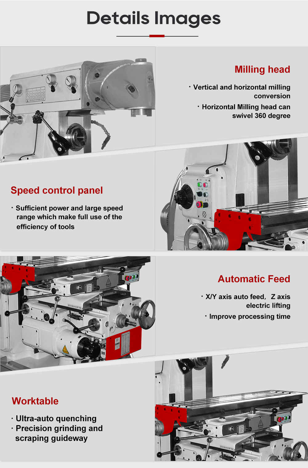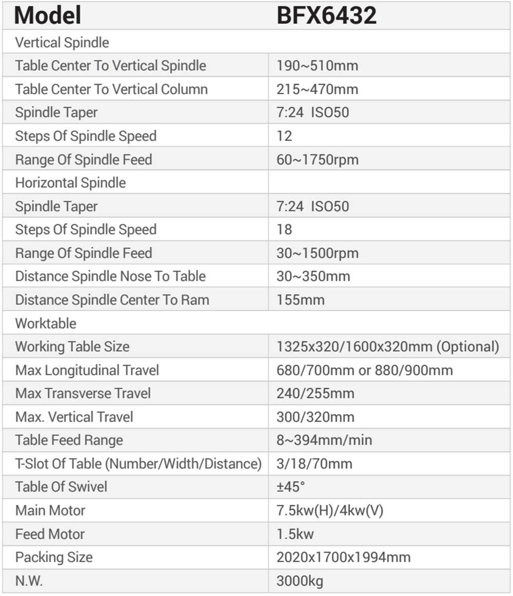 Universal Milling Machine BFX6432 With Vertical/Horizontal Spindle and Rotary TableTable Center To Vertical Spindle:190~510mmTable Center To Vertical Column:215~470mmSpindle Taper :7:24 ISO50Steps Of Spindle Speed:1275KW Universal Milling Machine , Multifunctional Milling Machine , Industrial-grade milling machine Inquiry Send Email