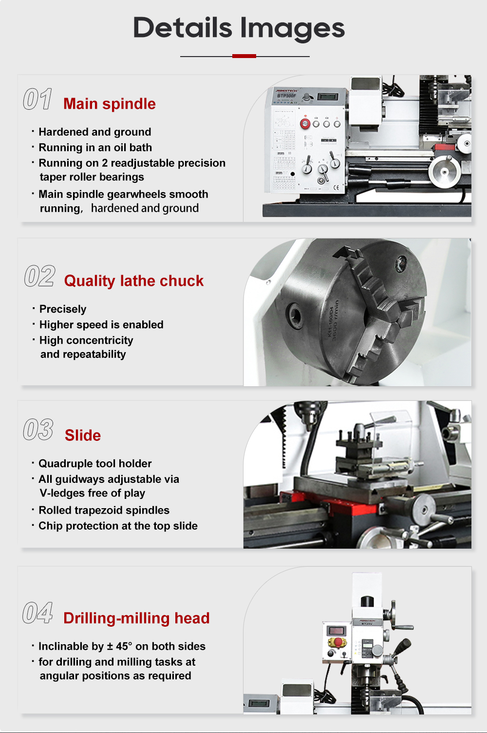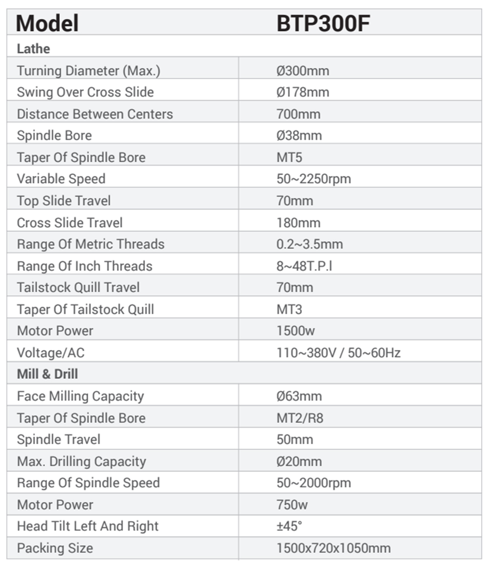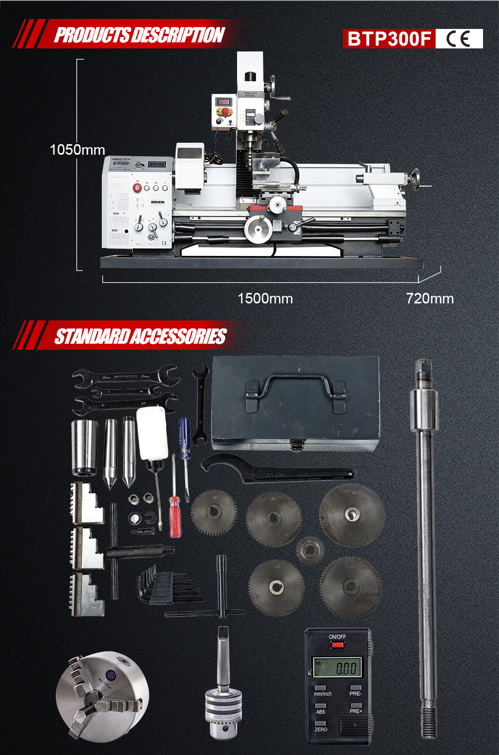 BTP300F 1.5kw mini manual combo lathe milling machineTurning diameter (Max.):Ø300mmSwing over cross slide:Ø178mmFace milling capacit:Ø63mmHead tilt left and right:±45° Inquiry Send Email